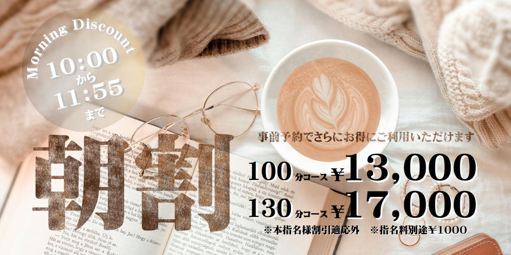 ご予約時に必ず【朝割】とお伝えください。 指名料+1,000円 ※本指名様適応外 前日までのご予約で更にお得!! 各コース1000円引きでご案内いたします